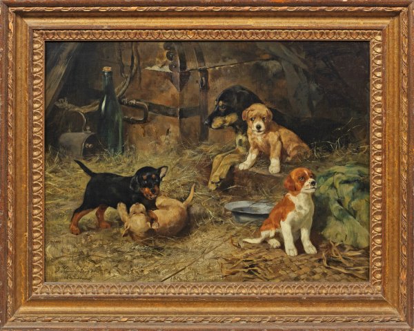 Lebendig geschilderte, drollige Darstellung einer Hundefamilie des bekannten Münchner Tiermalers, der an der Akademie studierte und sich im Atelier von Ernst Otto weiterbildete. Seit 1871 stellte Schmitzberger regelmäßig u. a. in Dresden, München und Wien aus. Öl/Lwd., doubl; L. u. sign. und bez.: München. 43 cm x 58 cm. Rahmen.