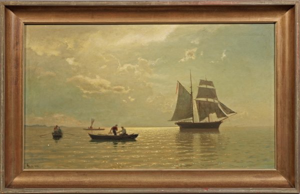 Atmosphärisch geschilderte Morgenstimmung. Der bedeutende norwegische Landschafts- und Marinemaler ging 1841 nach Düsseldorf, wo er bei Andreas Achenbach lernte und 1842-1846 in der Akademie und im Privatatelier bei Johann Wilhelm Schirmer studierte. 1852 zeichnete ihn die Berliner Akademie mit einer Goldmedaille aus. 1854 wurde Gude Nachfolger Schirmers als Professor für Landschaftsmalerei an der Düsseldorfer Akademie; 1864-1880 wirkte er als Direktor bzw. Professor an der Akademie in Karlsruhe. 1880 berief ihn schließlich Anton von Werner an die Berliner Akademie zum Leiter der Meisterklasse für Landschaftsmalerei. Zu seinen Schülern zählten u. a. Walter Leistikow und Paul Müller-Kaempff. Öl/Lwd.; L. u. sign. u. dat. 1880. Eine minim. Läsur in der Lwd.; 44,5 cm x 76,5 cm. Rahmen