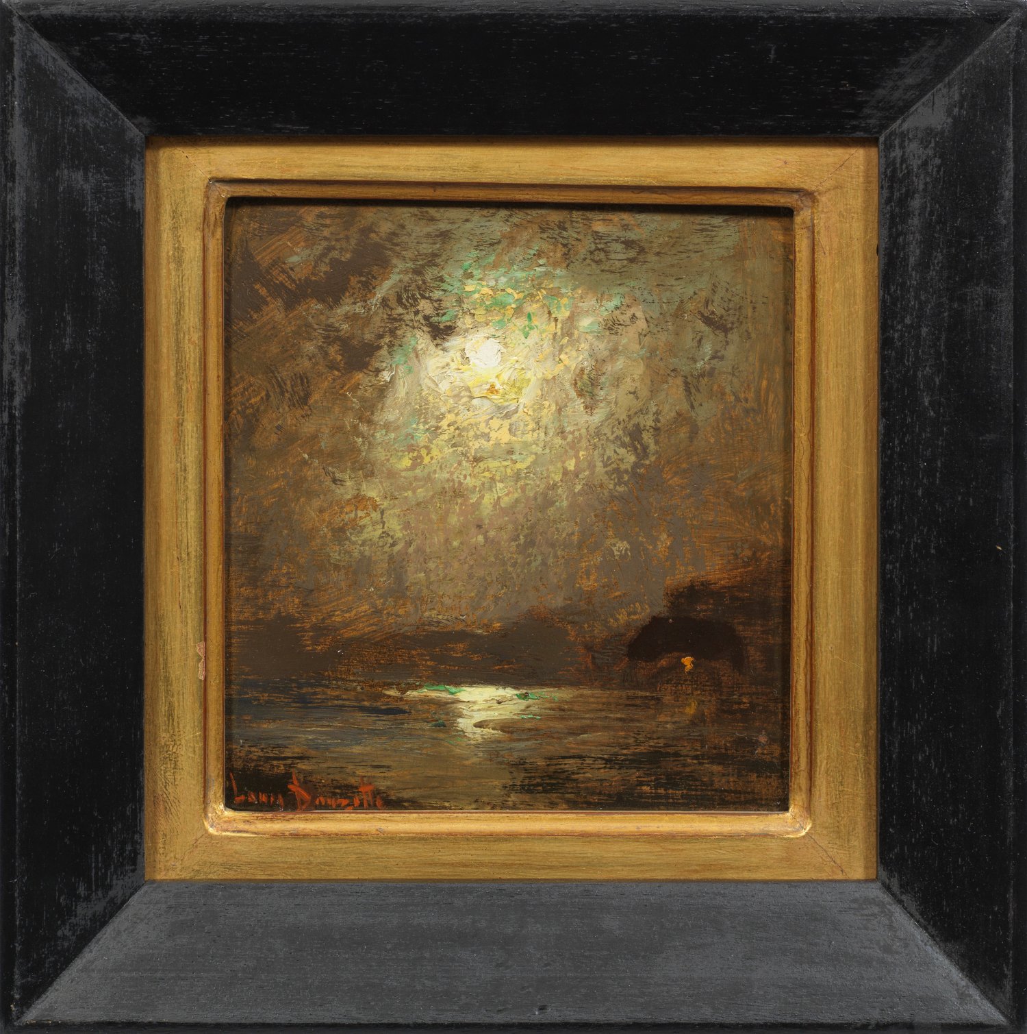 Charakteristische, mit sicheren, schnellen Pinselstrichen und pastosem Farbauftrag gemalte Mondscheinlandschaft Douzettes, der ab 1864 Schüler Hermann Eschkes in Berlin war und 1878 in Paris die Plein air-Malerei der Schule von Barbizon kennenlernte. Öl/Karton. L. u. sign.; 20 cm x 18,5 cm. Rahmen.
