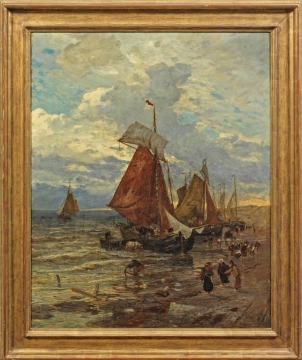 Das hochformatige in flotter Pinselführung gemalte Seestück zeigt das Bergen der Fracht nach dem Fischfang an der Nordseeküste. Das Anlanden der schweren Holzschiffe mit roten Leinensegeln auf den Sandstrand konnte vor der holländischen Küste nur mit der Zugkraft von Pferden erfolgen. Noch im Wasser stehend wurde die Fracht auf den Pferdekarren verladen und an Land gebracht. Frauen mit weißen Hauben und Holzpantinen nahmen die Fische in Körben in Empfang, um sie zuzubereiten oder auf dem Markt zu verkaufen. Scheveningen war durch die Maler der Haager Schule seit den 1870er Jahren zu einem beliebten Künstlerort avanciert, der auch zahlreiche Maler aus dem Nachbarland Deutschland anzog, allen voran Max Liebermann. Naturalistisch gemalte Hollandmotive verkauften sich zudem an die Sommerfrischler, die alljährlich in Zügen an die Küsten strömten. Während seiner Studienjahre in München reiste Schönleber ab 1873 in die Niederlande, um Motive für seine im Atelier ausgearbeiteten Gemälde zu sammeln. Öl/Lwd., doubl.; R. u. sign. und dat. München 1875; 87 cm x 71 cm. Rahmen.