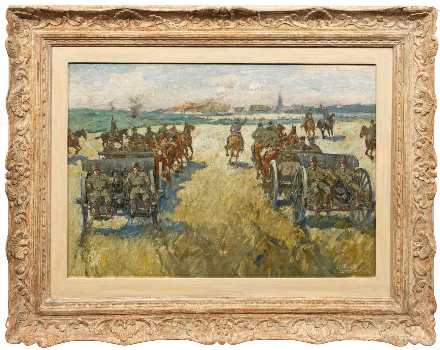 Mit schnellem, breitem Duktus und weich-pastosem Farbauftrag gemaltes, seltenes Militär-Motiv Sandrocks aus seiner Zeit als Soldat im I. Weltkrieg, als er u. a. in Galizien eingesetzt wurde. Sandrock erhielt seine künstlerische Ausbildung beim Landschafts- und Marinemaler Hermann Eschke. 1897 beschickte er erstmals die Große Berliner Kunst-Ausstellung, an der er sich danach regelmäßig beteiligte. 1913 erhielt er auf der Internationalen Kunstausstellung in München eine Goldene Medaille. Öl/Lwd.; R. u. sign.; Verso auf einem Original-Etikett vom Künstler eigenhändig bez. u. betitelt mit Adresse in Berlin-Friedenau. 54 cm x 79 cm. Rahmen.