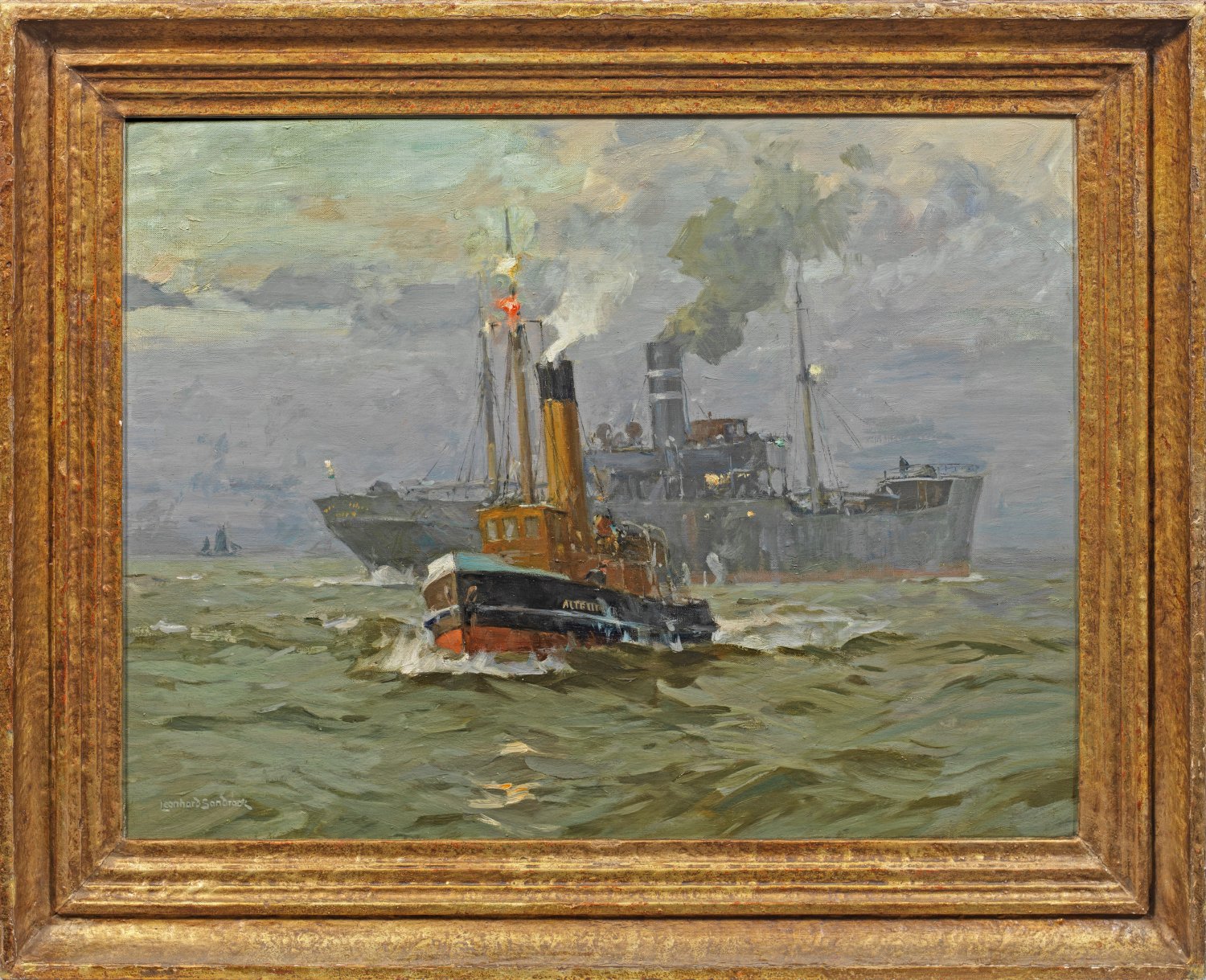 Mit sehr breitem, kraftvollem Duktus gemaltes, impressionistisches Werk Sandrocks, entstanden wohl um 1904-1913 in der bedeutendsten Periode des Berliner Malers. Sandrock beteiligte sich seit 1898 alljährlich an den Großen Berliner Kunstausstellungen und zeigte 1904 dort einen möglicherweise identischen "Lotsendampfer". Der namhafte Kunstkritiker Max Osborn rühmte Sandrock 1912 als "eins der stärksten und hoffnungsvollsten Talente der Berliner Malerzunft" und dessen furiosen Stil. Besonders fasziniert war Sandrock von der maritimen Welt. Öl/Lwd.; L. u. sign.; Verso auf einem Original-Etikett vom Künstler eigenhändig bez. u. betitelt mit Adresse in Berlin-Friedenau; ein altes Etikett einer Kunststausstellung bei Gustav Knauer, Berlin; drei Etiketten von Sandrock- Ausstellungen in Berlin, Bremerhaven und Wilhemshaven 1997/98. 61 cm x 81 cm. Rahmen.