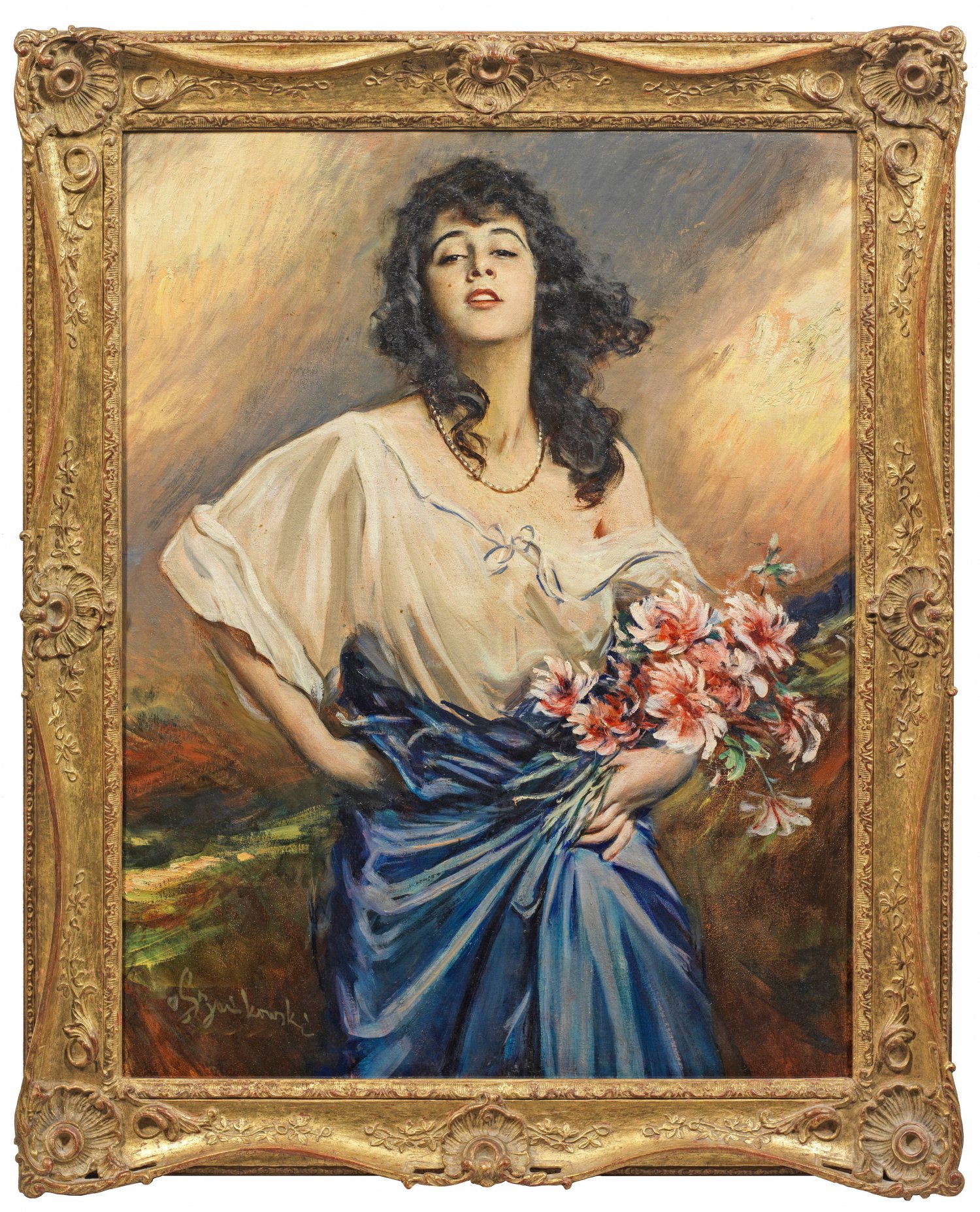 Mit schnellem, weich-pastosem Duktus ausgeführtes, repräsentatives Werk Szankowskis, wohl aus den 1930er/40er Jahren. Boleslaw von Szankowski studierte zunächst an der Akademie in Krakau, 1894 an der Münchener Akademie bei Johann C. Herterich (1894) und 1896-1898 in Paris an der Académie Colarossi und Académie Julian. Später ließ er sich in München nieder, wo er von 1906 bis 1925 an den Jahresausstellungen im Glaspalast teilnahm. 1928 und 1939 hatte er große Einzelausstellungen in Warschau. Als Porträtist sehr gefragt, schuf er daneben auch weibliche Akte, idealisierte, raffinierte, teilw. erotische Darstellungen weiblicher Schönheiten und graziöser, eleganter Damen. Öl/Lwd.; L. u. sign.; 93 cm x 75 cm. Rahmen.