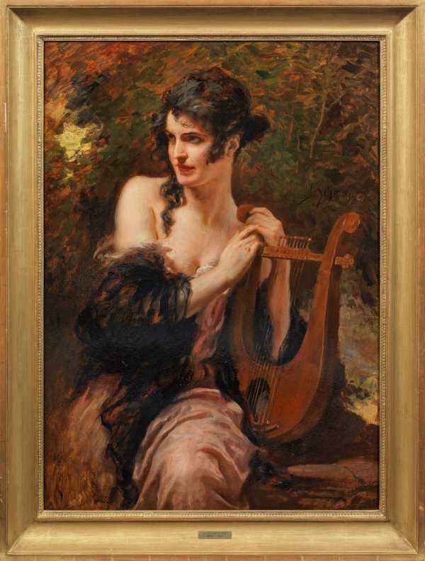 Mit einer Ausschließlichkeit wie bei keinem anderer Künstler seiner Zeit bestimmt das Bild der Frau das gesamte Schaffen Schmutzlers. Ganz im Sinne des Jugendstils und mehr noch des Symbolismus ist sie bei ihm niemals ein nahbares Wesen des Alltags, sondern stets in antikisch-mythologischer oder theatralisch-sentimentaler Entrücktheit wiedergegeben. R. M. sign.; Öl/Karton. 99 cm x 73 cm. Rahmen.