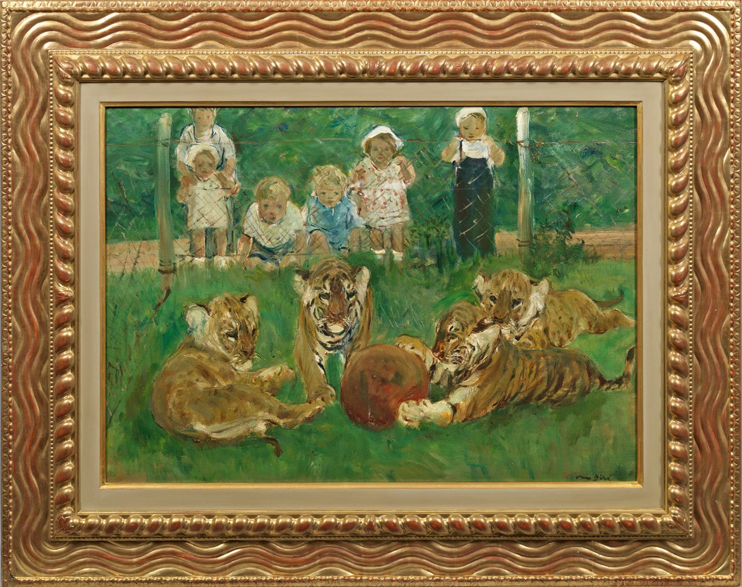 Zoo-Szene mit vier Raubkatzen, die von faszinierten Kindern im Hintergrund jenseits des Zaunes beobachtet werden. Mit kräftigen, breiten, virtuos lockeren Strichen angelegtes Werk Otto Dills. Der 1908-14 an der Münchener Akademie als Meisterschüler Heinrich von Zügels ausgebildete, spätimpressionistische Maler entwickelte eine beeindruckende Meisterschaft in der ausdrucksstarken und höchst lebendig wirkenden Darstellung von Tieren. Raubkatzen bildeten ein Hauptsujet seines Schaffens, die ihm den Namen "Löwen-Dill" eintrugen. Öl/Lwd.; R. u. sign.; Verso montiertes Lwd.-Stück mit gesticktem Nachlass-Siegel und Nr. 88 von Emmy Dorothea Dill, der Witwe des Künstlers. 60,5 cm cm x 90,5 cm. Rahmen.