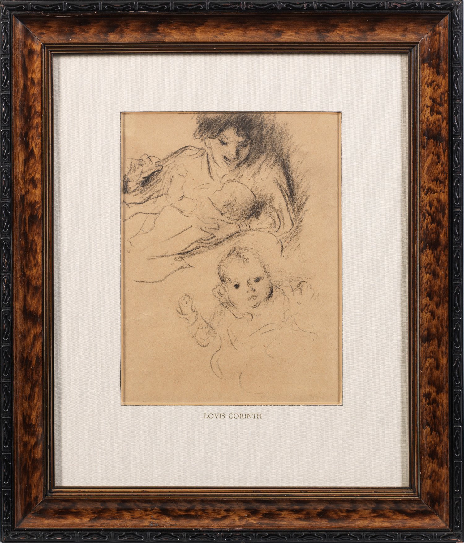 Die um 1905 entstandene, mit weich schwingenden Strichen ausgeführte Zeichnung entstand offensichtlich im persönlichem Umfeld des Künstlers und dürfte seine Frau Charlotte Berend-Corinth und den 1904 geborenen Sohn Thomas darstellen. Corinth war eine der bedeutendsten Künstlerpersönlichkeiten zu Beginn des 20. Jhs., der den Schritt vom Impressionismus zum Expressionismus ging. Er war zugleich Begründer der Münchner und Berliner Secession, deren Vorsitzender er 1915 wurde. Das vorliegende Blatt gehört zu einer um 1905-1911 entstandenen Werkgruppe von Zeichnungen, Druckgrafiken und Gemälden, in denen Corinth in einfühlsamer Weise Mütter mit ihren Kindern sowie die eigene Familie schilderte. Schwarze Kreide/Papier. Verso zweifacher Nachlass-Stempel "ATELIER LOVIS CORINTH". Blatt 29,5 cm x 21 cm. Rahmen.