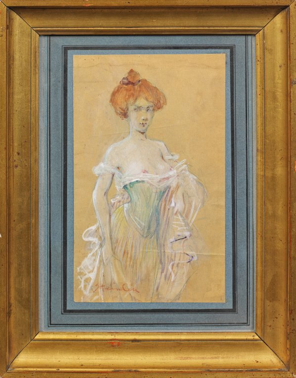 Bildnis einer stehenden Kokotte in freizügiger Pose. Außergewöhnlich erotisches Blatt des bedeutenden französischen Malers, Zeichners, Karikaturisten, Illustrators und Plakatkünstlers, der 1878 nach Paris ging und dort rasch zu den wichtigsten Künstlern des Montmartre zählte. Er gehört zu den Stammgästen des legendären Kabaretts "Le Chat Noir", für das er Plakate schuf und wo er u. a. Aristide Bruant, Henri Toulouse-Lautrec und Félix Vallotton kennenlernte. Zu seinem Freundeskreis zählten überdies Schrifsteller wie Emile Zola und Anatole France. Ab 1893 präsentierte er seine Werke im Salon des Indépendants, 1903 beteiligte sich Steinlen mit über 150 Werken an der Berliner Sezessionsausstellung. Mischtechnik (Aquarell bzw. Gouache mit Weißhöhungen und Farbstiften)/hellbraunes Papier. L. u. sign.; Blatt ca. 26 cm x 15,5 cm. Rahmen.