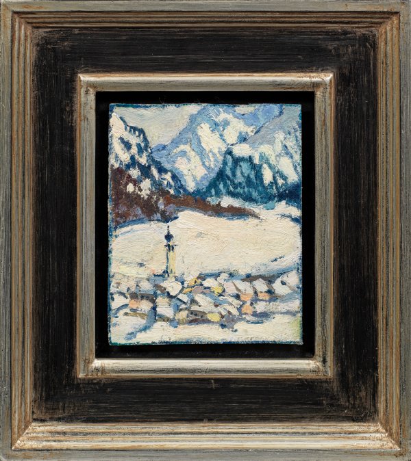 Spätimpressionistisches Werk Köhler-Roebers, die 1906-1914 in der fortschrittlichen Malschule von Johannes Walter-Kurau in Dresden und der Debschitz-Schule in München lernte. Öl/Karton, auf dicken Karton kaschiert. Verso Etikett mit Nachlass-Stempel u. Nr. 94 sowie Etikett der Retrospektive im Museum Zitadelle, Berlin-Spandau, 2020. 18 cm x 14,5 cm. Rahmen.