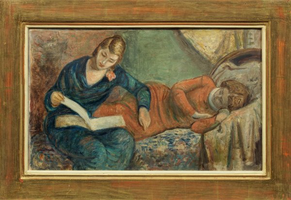 Szenische Darstellung mit einem lesenden und liegenden Mädchen auf einem Bett. Frühes, spätimpressionistisches Werk Laibles, der an der Landeskunstschule in Karlsruhe bei Georg Scholz und Walter Conz studierte sowie an der Karlsruher Kunstgewerbeschule Meisterschüler von Ernst Würtenberger war. 1924 unternahm er seine erste Paris-Reise. 1933 wurde Laible zwar für den Villa-Massimo-Preis vorgeschlagen, jedoch wegen seiner Frankophilie abgelehnt. 1947 berief man ihn zum Leiter einer Zeichenklasse an die Karlsruher Akademie, 1949 wurde er Professor. Öl/Malkarton. L. u., sign. u. dat. 1932. Verso bez. und betitelt "2 Mädchen (/) Gretel u. Lina (...?)". 35,5 cm x 57,5 cm. Rahmen.