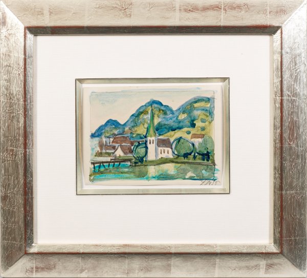 In teilw. frisch leuchtendem Kolorit ausgeführte Vedute, die Dix mit wenigen Bleistiftstrichen anlegte und dann in großen Flächen aquarellierte. Zentrales Motiv ist die weiße Kirche mit seiner hoch aufragenden, kupfergrünen Turmspitze. Die Arbeit aus dem Spätwerk des Expressionisten gehörte zu seiner großen Werkgruppe von Bodensee-Landschaften - im Entstehungsjahr des Blattes 1955 malte er u. a. eine Ansicht der Pfarrkirche in Gaienhofen-Horn mit seinem markanten Treppengiebel. Dix lebte seit 1936 mit seiner Familie in einem eigenen Wohn- und Atelierhaus in Hemmenhofen auf der Halbinsel Höri am Bodensee. Es wurde zu seinem Rückzugsort und Refugium, wo er die umgebenden Landschaften zeichnete und malte. Nach einer Phase von Darstellungen im altmeisterlichen Stil rang er der Idylle ab 1946 wieder eine expressionistische Dramatik ab, die sein reifes Oeuvre kennzeichnet. Aquarell über Bleistift/Papier. R. u. sign. u. dat. (19)55. Blatt ca. 16,5 cm x 23 cm. Rahmen.