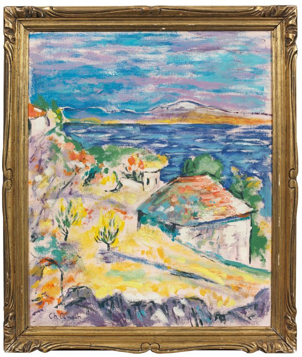 Leuchtend farbige fauvistische Landschaft des Künstlers. Das Gemälde gehört zu einer Werkgruppe mit dem gleichen Motiv, die Camoin in mehreren Versionen 1941 in St. Tropez malte; eine davon "Le Favouillou aux trois pins" wurde 2016 bei Christie's in New York für $ 60.000,- versteigert. Camoin studierte ab 1898 in Paris, wo er Freundschaft mit Albert Marquet und Henri Matisse schloss; zugleich setze er sich intensiv mit Vincent van Gogh auseinander, von dem er 1901 selbst ein Gemälde erwirbt, außerdem mit Paul Cézanne, der im selben Jahr ein väterlicher Freund Camoins wurde. 1903 schloss sich Camoin den "Fauves" (="Die Wilden") um Marquet und Matisse an, stellte 1904-1907 mit ihnen in der Avantgarde-Galerie Berthe Weills aus und nahm am legendären Salon d’Automne des Jahres 1905 teil. 1921 ließ er sich in Saint-Tropez nieder und malte in der Folge viele Ansichten der Stadt und seiner Umgebung. Öl/Lwd.; L. u. sign.; Verso Original-Etikett "Aux Galerie Lafayette Paris". 45,5 cm x 37,5 cm. Original-Rahmen.