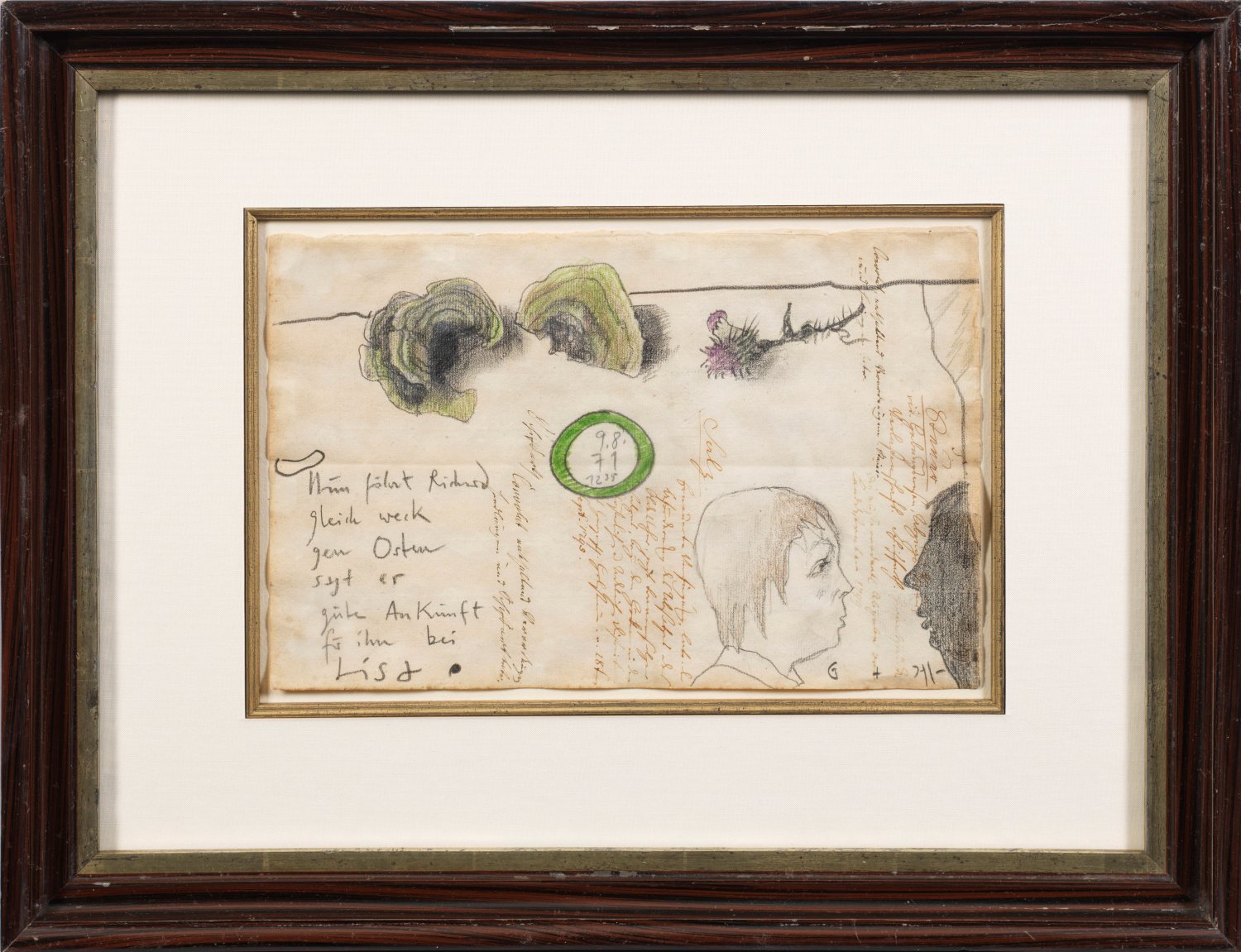 Janssen verwendete für diese Arbeit einen alten, bereits um 1800 beschrifteten Papierbogen, legte ihn quer und verteilte seine Text- und Motivideen in impulsiv freier, spontaner Weise über das Blatt, wobei er außer dem Datum (9.8.71) auch die genaue Uhrzeit (12.35) der Entstehung festhielt. Die Textzeilen in der linken unteren Ecke beziehen sich auf den befreundeten Schriftsteller, Drehbuch- und Hörspielautor Richard Hey (1926 - 2004): "Nun fährt Richard (Hey) gleich weck gen Osten sagt er gute Ankunft für ihn bei Lisa (Kristwaldt)". Gegenüber zeichnete er Profilköpfe von sich selbst und seiner damaligen Lebenspartnerin Gersche Tietjens, oberhalb fügte er eine Distelblüte und zwei amorphe Motive als kontrastive Stilllebenelemente ein. Im Jahr 2000 wurde Janssen, einem der bedeutendsten deutschen Zeichner in der Kunstgeschichte, ein eigenes Museum in Oldenburg gewidmet. Bleistift u. Farbstifte/altes Papier. R. u. sign.; mittig dat. 9.8.(19)71. Blatt 20 cm x 31 cm. Rahmen.
