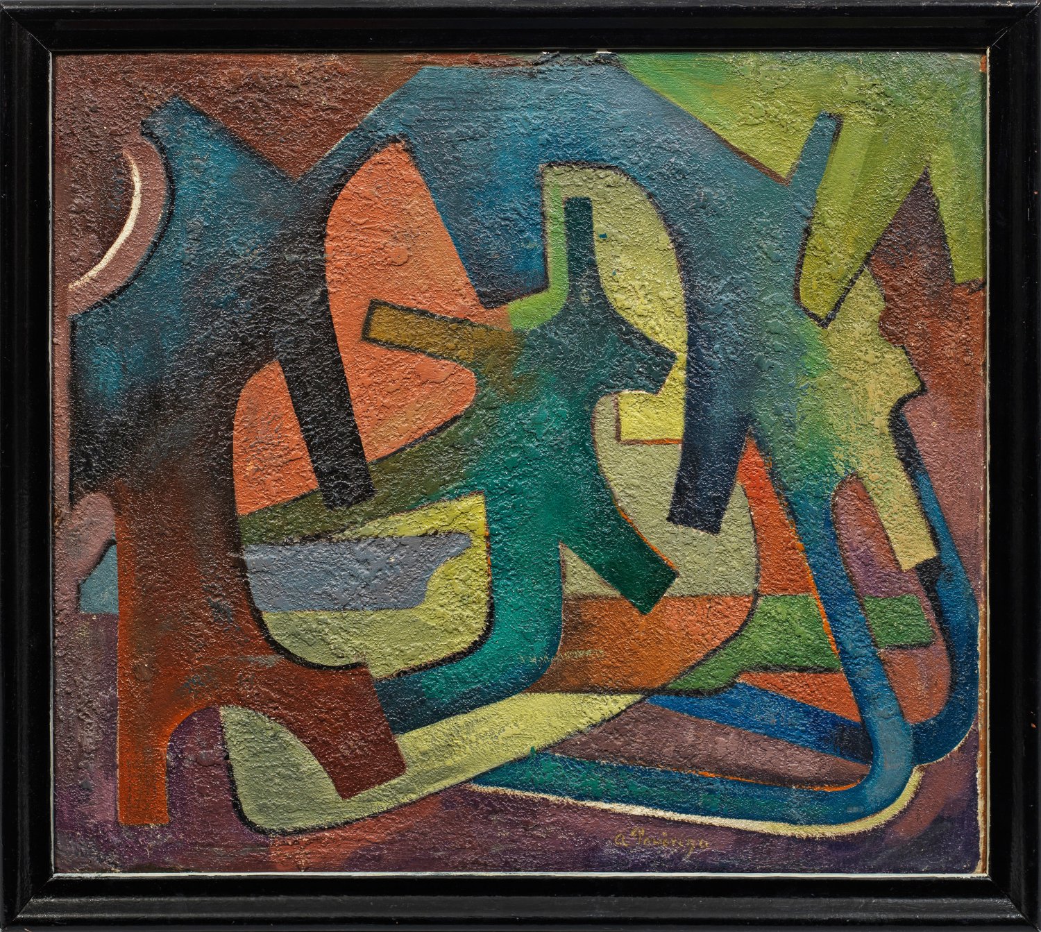 Aus gerundeten, teilw. amorphen, sich überlappenden Formen und Farben gebildete Komposition mit reliefartigem, rauen Farbauftrag. Nach der Heirat 1912 mit Friedrich Ahlers-Hestermann besuchte sie die Damenmalschule von Simon Hollósy in München und malte an der Académie Russe bei Marie Vassilieff in Paris, einem Treffpunkt der künstlerischen Avantgarde. Zusammen mit ihrem Ehemann gründete sie 1919 die Hamburger Sezession und wandte sich vermehrt der Abstraktion zu. 1931 wurde sie Mitglied der Pariser Künstlergruppe Abstraction-Création. Ab 1946/47 war sie Dozentin an der Kunsthochschule Berlin-Weißensee. Öl/Malkarton. R. u. sign.; Verso ein Landschaftsgemälde von H. J. Pätzold, sign. u. dat. (19)50. Öl/Malkarton. 70 cm x 80 cm. Rahmen.