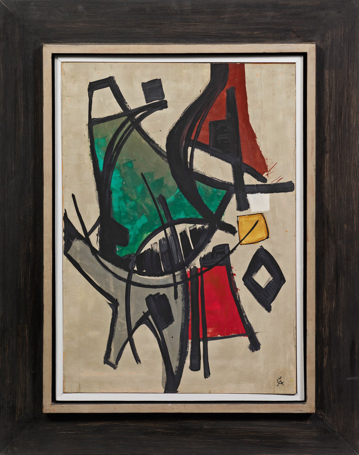 Cavael, der bereits 1924-1926 abstrakt malte und im "Dritten Reich" verfemt war, gehört zu den bedeutendsten Künstlern ungegenständlicher Kunst der Nachkriegszeit. 1949 gründete er u. a. mit Willi Baumeister die Gruppe "ZEN 49". 1954 hatte er eine Einzelausstellung in der Kestner-Gesellschaft, Hannover; 1958 nahm er an der XXIX. Biennale in Venedig teil. Öl/Malkarton. R. u. Ligatur-Monogr. "CA". Verso sign. mit Werk-No. und Dat. "No. 54/19" versehen. 64 cm x 45,5 cm. Rahmen.