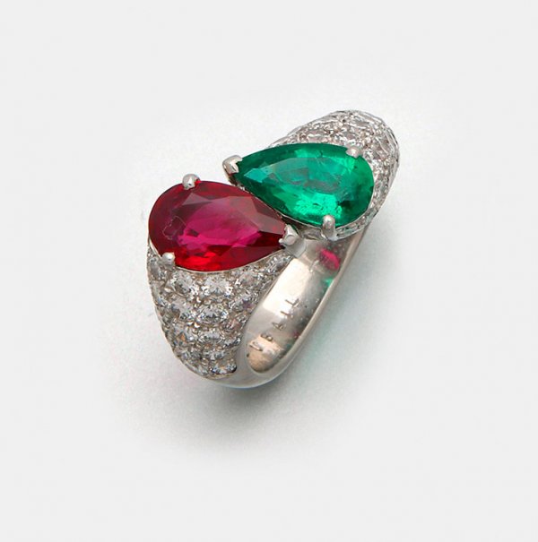 Hochqualitätvoller Multicolorring von La Maison Dubail Paris Platin. Leicht verlaufende, diagonal versetzte Ringschiene, besetzt mit jeweils einem natürlichen kolumbianischen tannengrünen Smaragd von ca. 1,82 ct. und einem korrespondierenden taubenblutroten Rubin von ca. 2,06 ct., begrenzt von Diamanten von zus. ca. 2,00 ct. (F-G/vsi), in Pavéfassung. Gew. ca. 14,05 g.