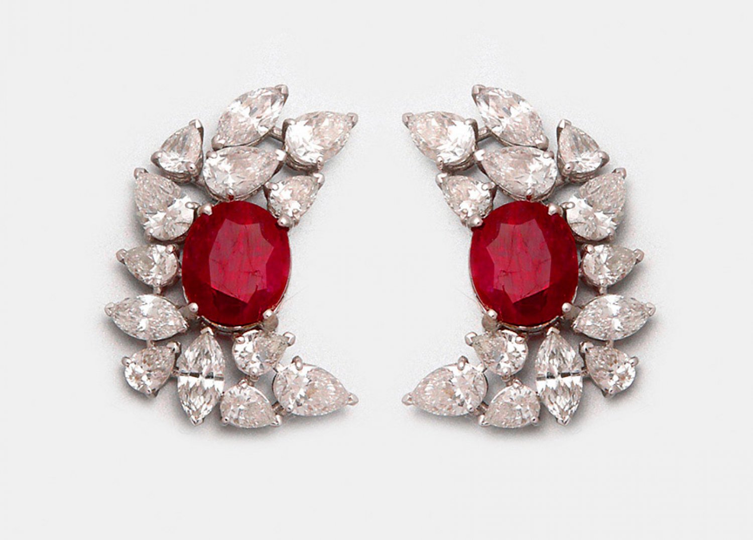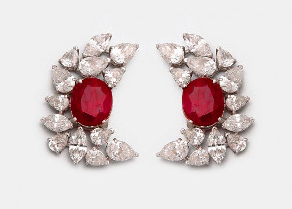 A pair of earrings set with two natural pigeon blood red rubies each approx. 1,98 ct. with no indications of heating and diamonds approx. 4,60 ct. (H-J/si-pi), in 18 k white gold. Certificates included.