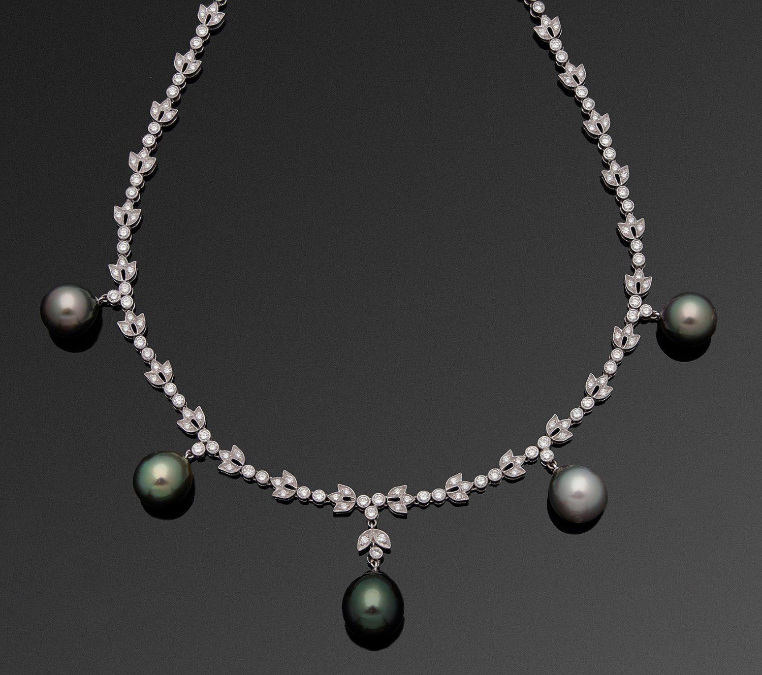 Elegantes Tahiti-Perlcollier im viktorianischen Stil Weißgold, gest. 750. Schauseitig besetzt mit insges. 188 Brillanten von zus. ca. 5,07 ct. (F-G/vsi), akzentuiert durch fünf makellose Tahitiperlen in den Farben schwarz, silbergrau, anthrazit und olivgrün in sehr schönem violettgrün changierendem Lüster. Gew. ca. 41,23 g.