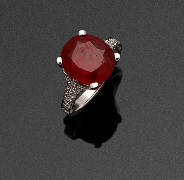 A ring set with a pigeon blood red ruby approx. 6,21 ct. with no indications of heating and small diamonds, in 18 k white gold. Certificate included.