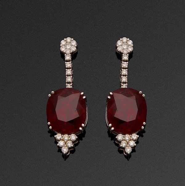 Paar glamouröse Natural Burma-Spinell-Ohrgehänge Weißgold, gest. 750. Besetzt mit zwei unbehandelten, dunkel purpurfarbenen Spinellen von jeweils ca. 16,98 ct. und 15,42 ct. und Brillanten von zus. ca. 0,60 ct.; Ges.-Gew. ca. 16,30 g.