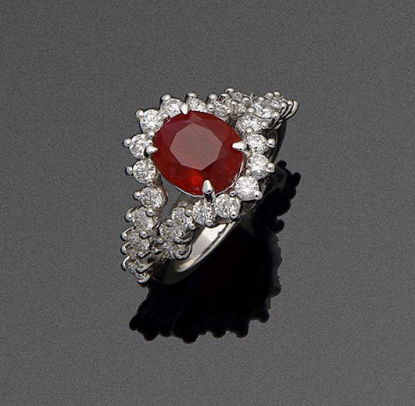 Exquisiter Burma-Rubinring Weißgold, gest. 750. Zentral besetzt mit einem unbehandelten, transparenten taubenblutroten Rubin von ca. 3,18 ct., entouriert von Brillanten von zus. ca. 1,30 ct. (I-J/si-pi). Gew. ca. 7,44 g.