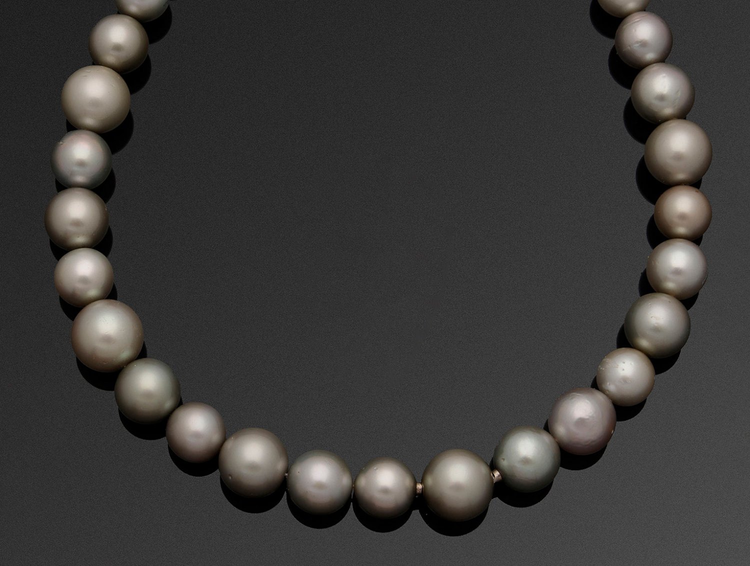 Elegantes Tahiti-Perlencollier Einreihige Kette aus insg. 36 silber-grauen, nahezu makellosen Südsee-Zuchtperlen von ca. 10,4 mm - 13,2 mm, in sehr feinem rosé-grünen Lüster. Gew. ca. 88,50 g.