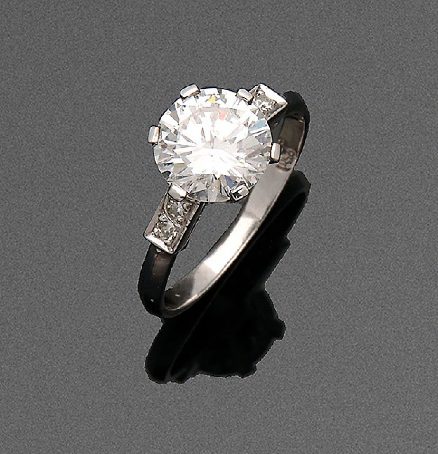 Klassischer Brillant-Solitärring Platin, gest. 950. Zentral besetzt mit einem Brillanten von ca. 2,23 ct. (G/pi), flankiert von kleinen Diamanten. Gew. ca. 4,39 g.