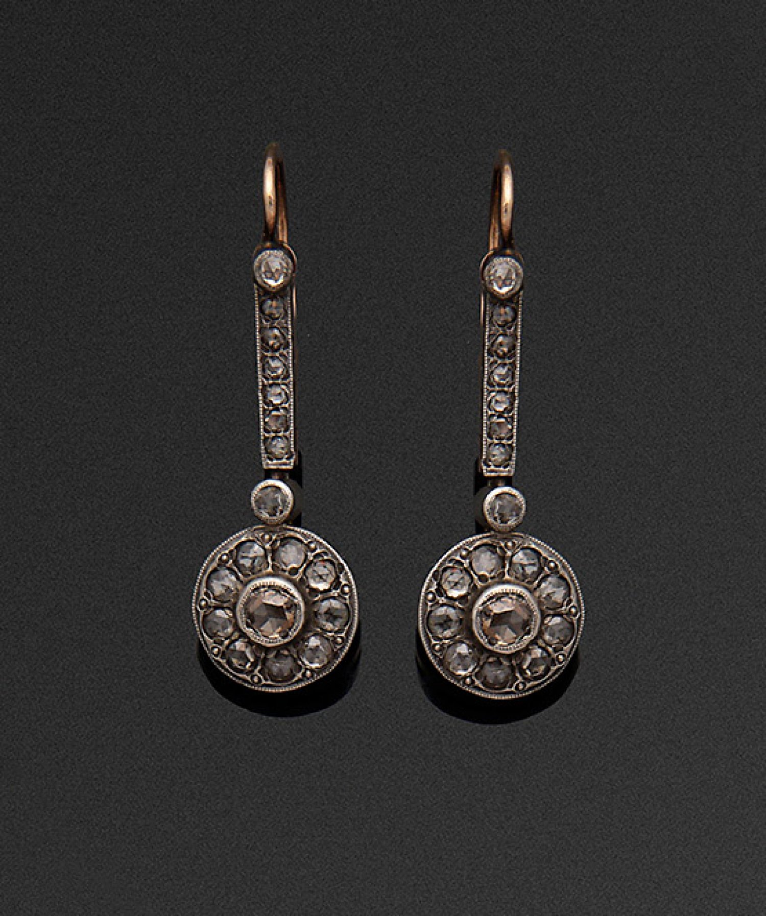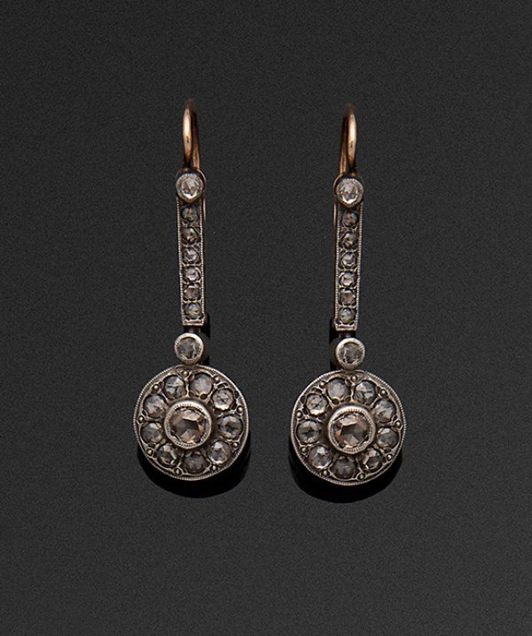 Paar russische Belle Epoque Diamant-Ohrgehänge Gelbgold, gest. 56 (583) und Silber. Schauseitig besetzt mit Diamantrosen. Ges.-Gew. ca. 5,24 g.