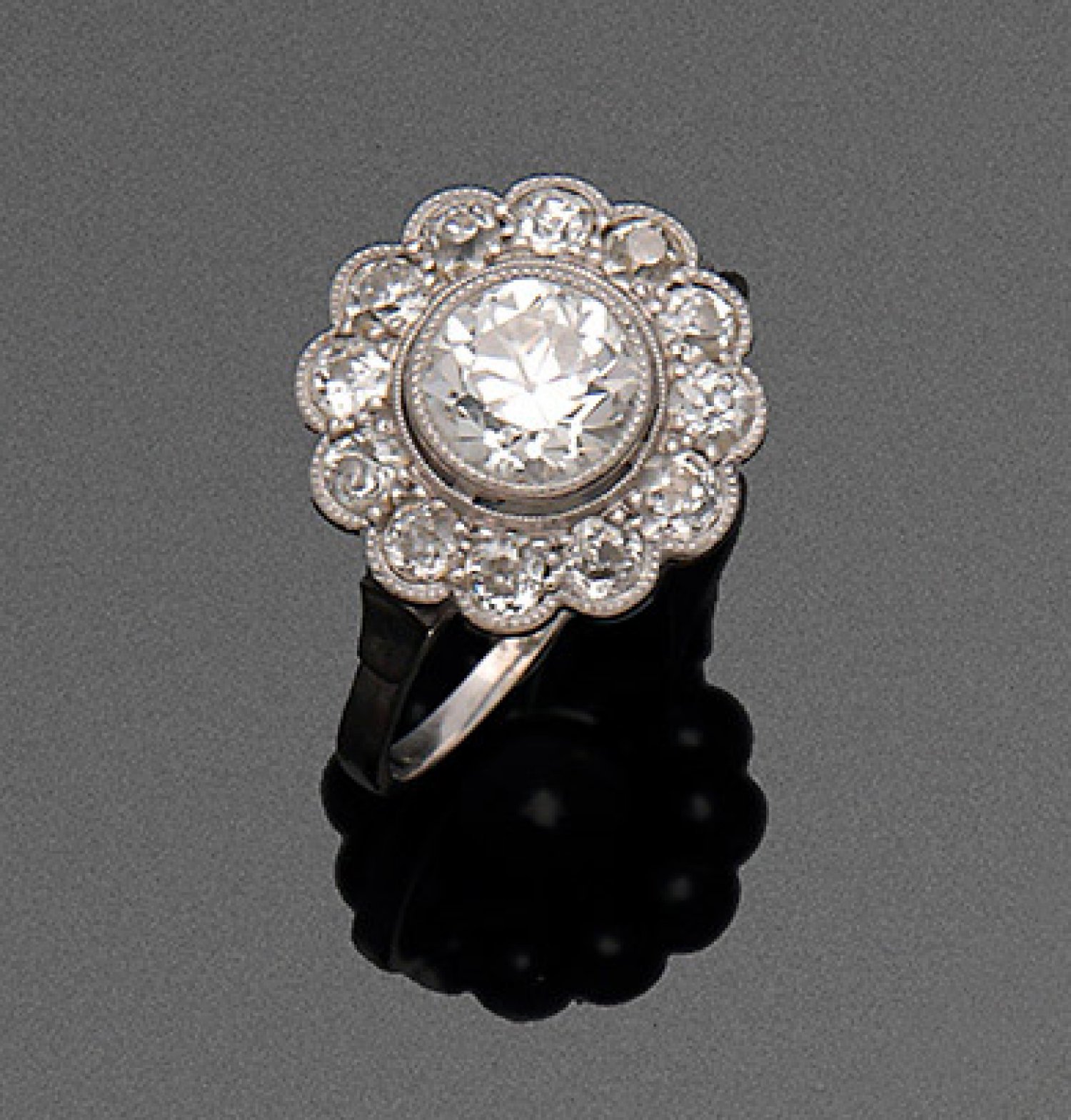 Feiner Jugendstil-Diamantring Platin. Zentral besetzt mit einem Altschliffdiamanten von ca. 0,75 ct., entouriert von korrespondierenden Diamanten von zus. ca. 0,30 ct. ; Gew. ca. 3,57 g.