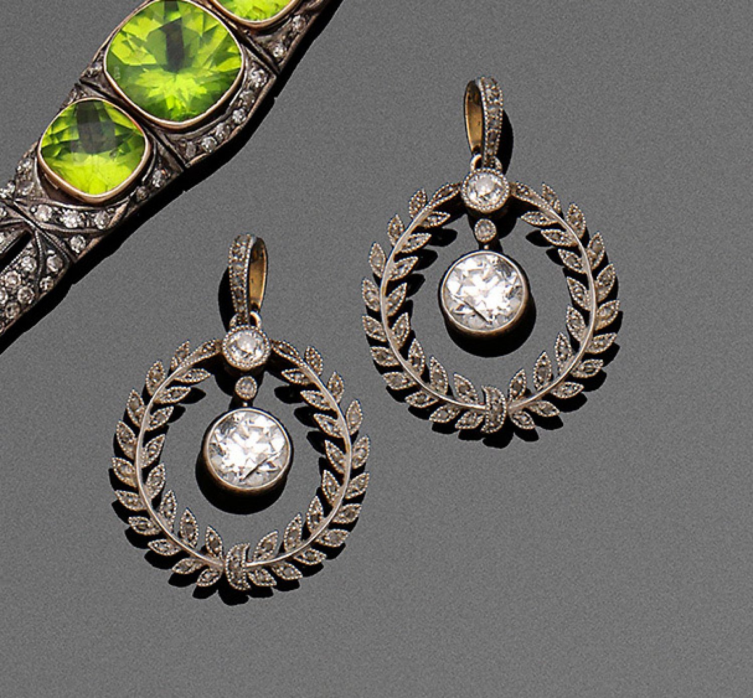 Feiner Jugendstil-Diamantanhänger Gelbgold, teilw. platiniert. 14 ct.; In Form eines Lorbeerkranzes, schauseitig besetzt mit einem Altschliffdiamanten und mittig ein beweglicher Altschliffdiamant von ca. 0,50 ct.; Gew. ca. 2,96 g.