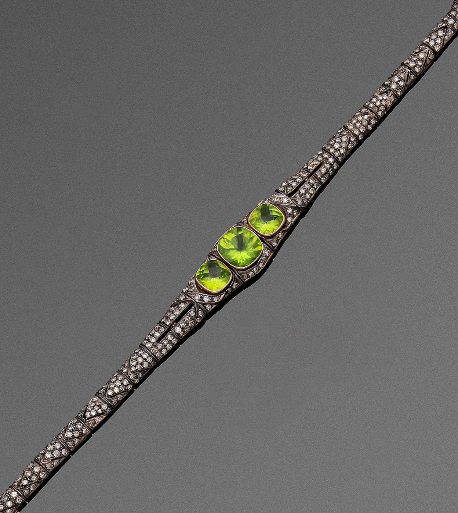 Peridot-Diamant-Armband im Art Deco-Stil in Ajour Gelbgold, teilw. mit Silber verbödet, gest. 750/925. Schauseitig besetzt mit Diamanten von zus. ca. 3,60 ct. und drei apfelgrünen Peridots von zus. ca. 8,30 ct., umzogen von feinen Millegriffbändern. Gew. ca. 19,76 g.