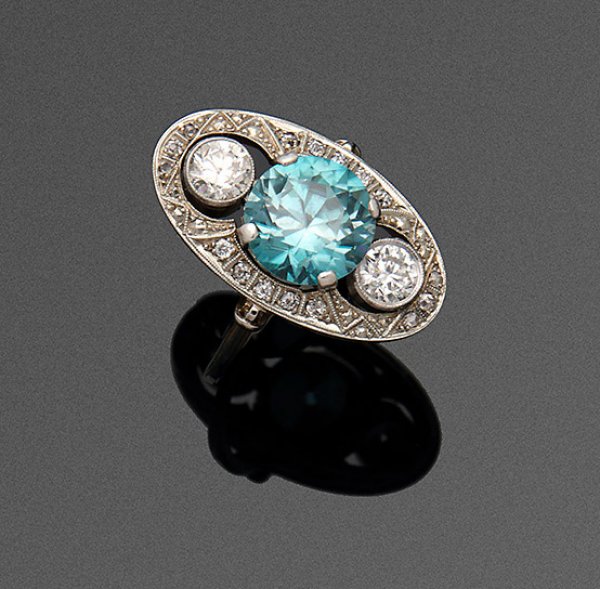Art Déco Marquise-Ring Platin. Zentral besetzt mit einem türkisblauen Farbstein ca. 4,00 ct., flankiert von zwei Altschliffdiamanten von zus. ca. 0,50 ct.und kleinen korrespondierenden Diamanten. Gew. ca. 7,18 g.