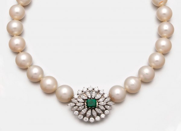 Hochqualitätvolles Südsee-Perlcollier von Mauck Weißgold, gest. 750. Einreihige Kette aus insges. 30 weißen Südsee-Zuchtperlen von ca. 12,3 mm, in sehr feinem rosé-grün changierendem Lüster. Schließe in Form einer Blütenrosette ausgefasst mit Brillanten und Diamantnavetten von zus. ca. 4,00 ct. (F-G/H/vs-si) und einem Smaragd von ca. 1,00 ct; Gew. ca. 90,58 g.