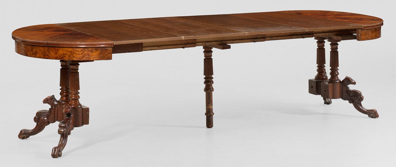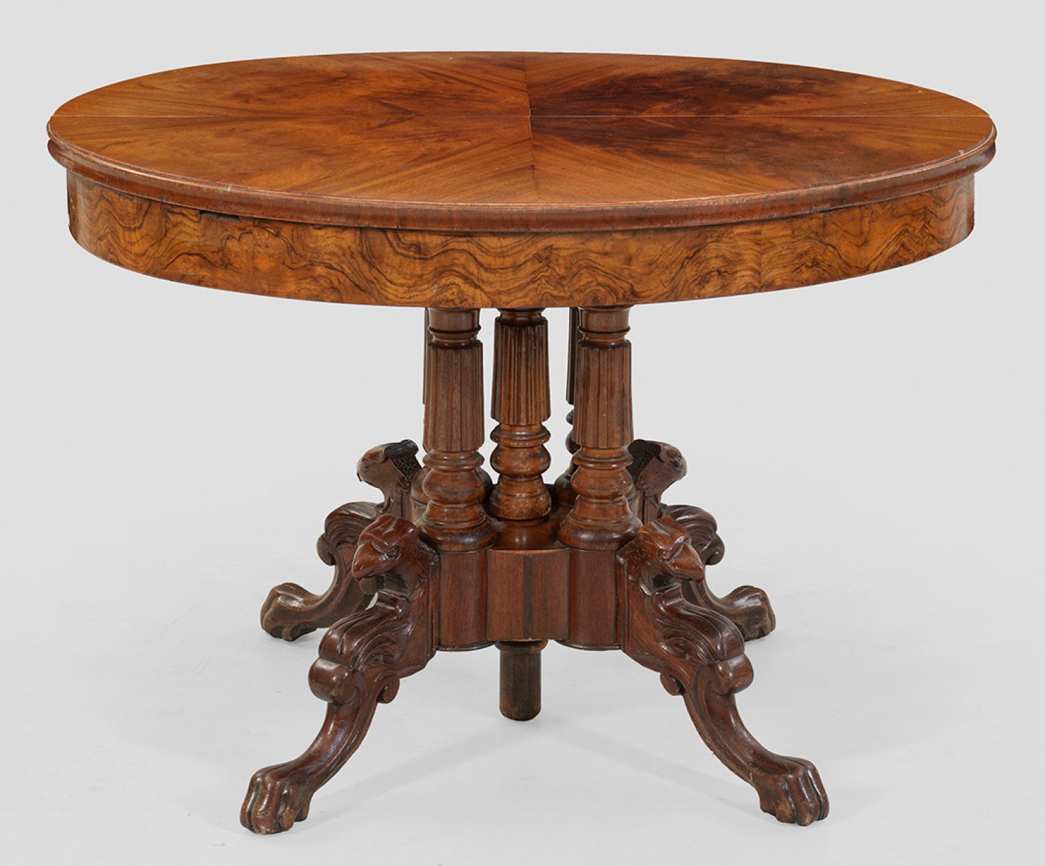 Viktorianischer Ausziehtisch Nussbaum und Nussbaummaser, massiv und furniert. Über passig geschweiftem Sockel, auf stark geschwungenen Beinen mit Greifenköpfen kannelierte Balustersäulen als Träger für bombierte Zarge und gering überstehende Deckplatte. Dazu vier erg. Einsteckplatten. H. 75,5 cm. 110 cm x 89/281 cm.