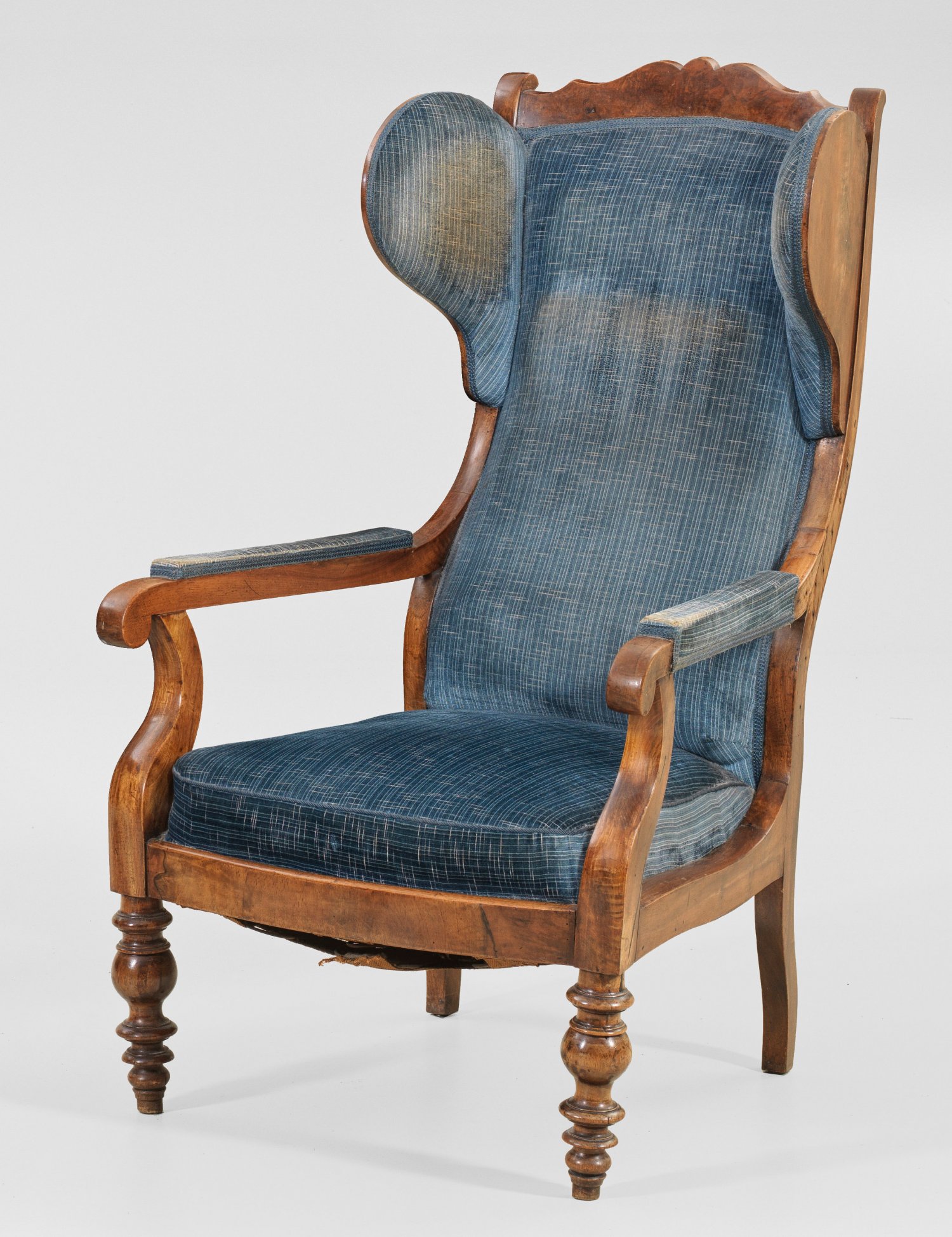 Spätbiedermeier-Ohrenbackensessel Nussbaum. Trapezförmige, leicht bombierte Zarge auf Balusterbeinen. Gebogte Stütze für schmale Armlehnen. Hohe, leicht zurückschwingende Rückenlehnenrahmung mit seitlichen Ohrenbacken. Altersspuren H. 116 cm. 67 cm x 77 cm. Sitz-H. 40 cm.