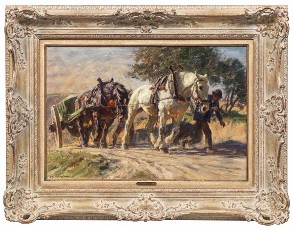 Impressionistisches Werk des Tiermalers, der sich intensiv mit der Verbindung von Mensch und Tier auf dem Land auseineinandersetzte, besonders Bauern mit Arbeitspferden und Ochsen, Hirten etc.; 1904 wurde er nach seinem Studium bei Heinrich von Zügel in München Leiter der Meisterklasse für Tier- und Freilichtmalerei an der Düsseldorfer Akademie. Öl/Lwd.; L. u. sign.; 40,5 cm x 60,5 cm. Rahmen.