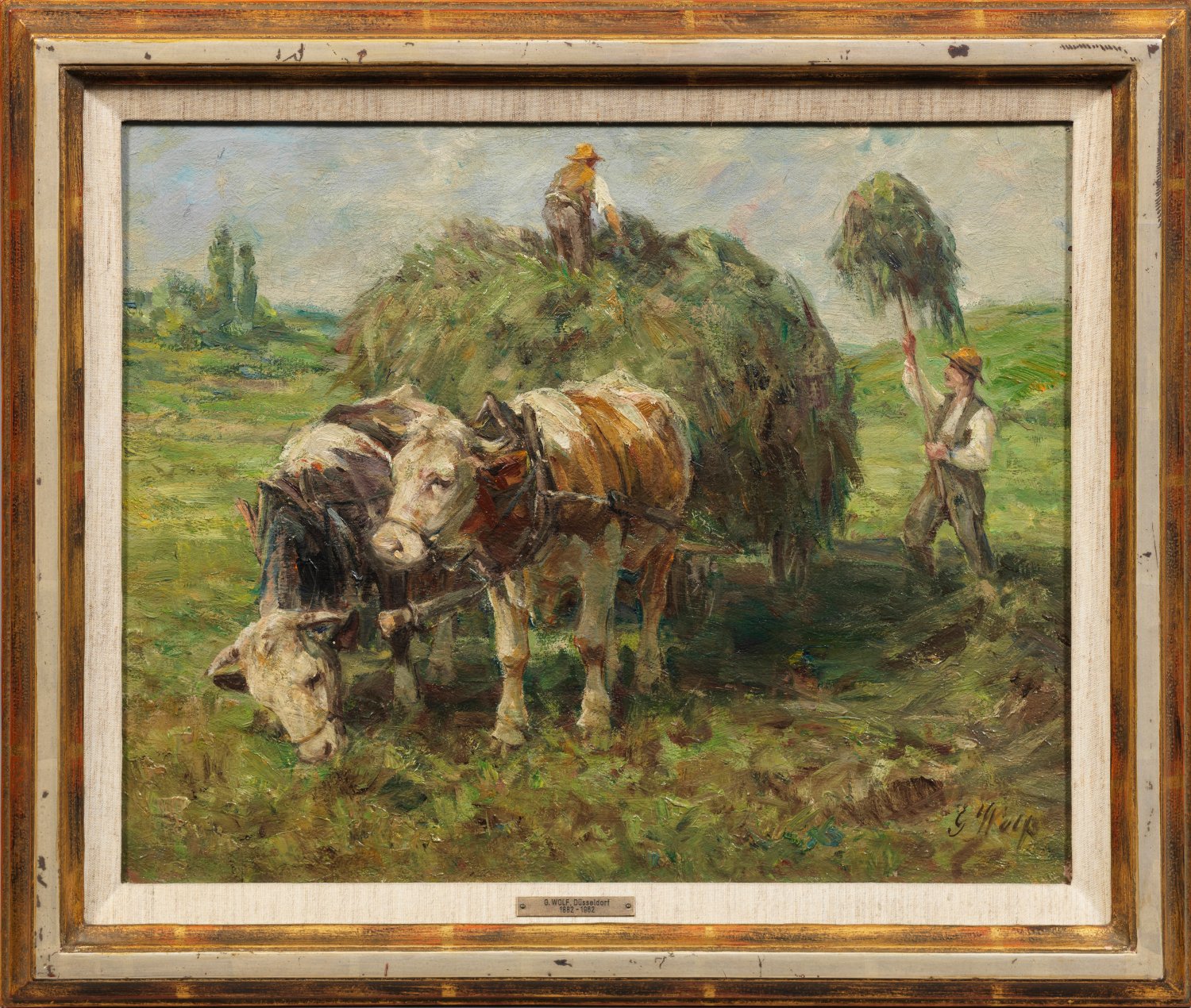 Impressionistisches Werk Wolfs, der Meisterschüler von Julius Paul Junghanns an der Düsseldorfer Akademie war und 1909-1914 bei Heinrich von Zügel lernte. Öl/Lwd.; R. u. sign.; 39 cm x 49 cm. Rahmen.
