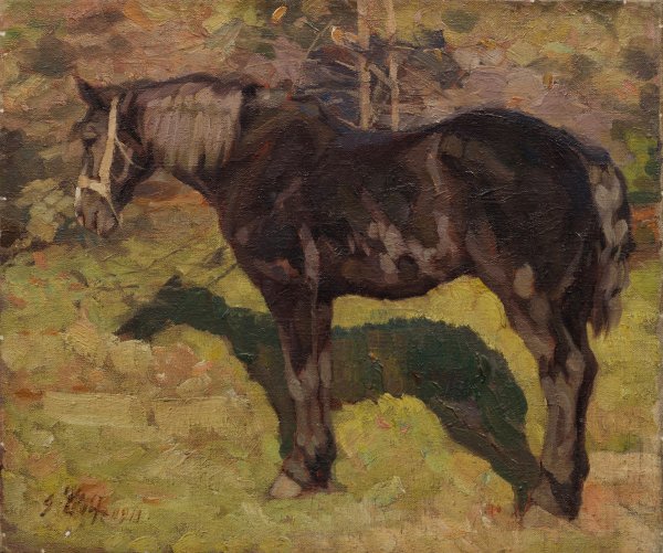 Charakteristisches Pferdeporträt des renommierten Tiermalers, der an der Düsseldorfer Kunstakademie Meisterschüler von Julius Paul Junghanns war und seine Studien 1909-1914 an der Tiermalschule Heinrich von Zügels fortsetzte. L. u. sign.; 50 cm x 60,5 cm.