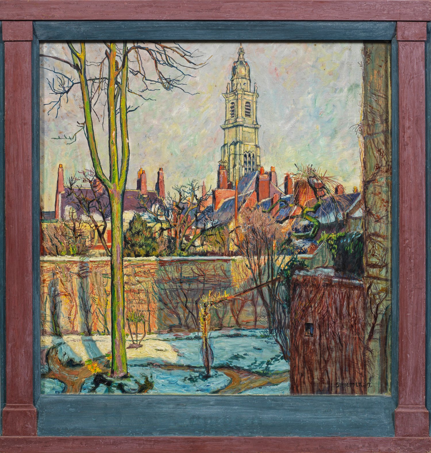 Expressionistische, in Rosa und Violett getauchte winterliche Ansicht einer belgischen Kleinstadt mit Kirchturm. Noch während der Vorbereitung auf ein Akademiestudium in München wurde Schoedder zum Soldaten des Ersten Weltkriegs, wo er offenbar 1917 dieses ausdrucksstarke, von den französischen Fauves inspirierte Bild malte. Öl/Platte.; R. u. sign.u. dat. (19)17; 53 cm x 54 cm. Rahmen.