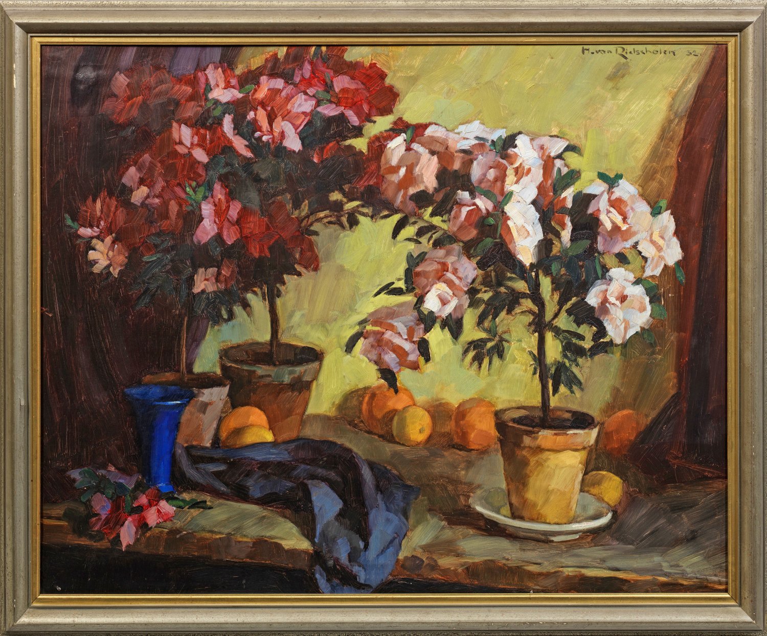 Mit breitem Pinsel pastos und kraftvoll im Stil der Neuen Sachlichkeit gemaltes Blumenstillleben vor einer gelben Wand. Öl/Lwd.