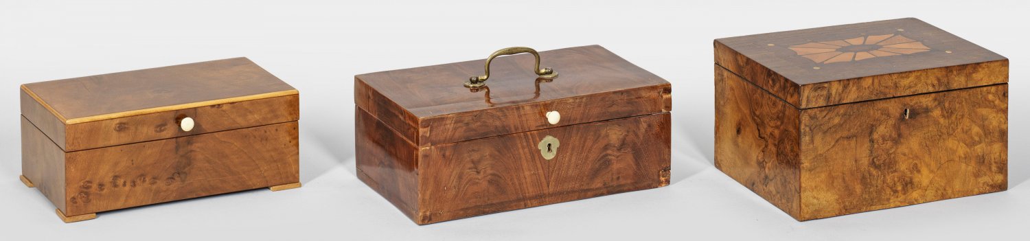 Drei Biedermeier-Schatullen Nussbaum und Mahagoni, furniert sowie teilw. Einlagen aus unterschiedlichen Edelhölzern und Perlmutt. Gerader, rechteckiger Korpus, teilw. auf gescheibten Füßen. Dem Korpus entsprechende Flachdeckel. H. 10 cm. 24 cm x 14 cm; 11,5 cm. 28 cm x 15 cm; H. 14 cm. 24 cm x 18 cm.