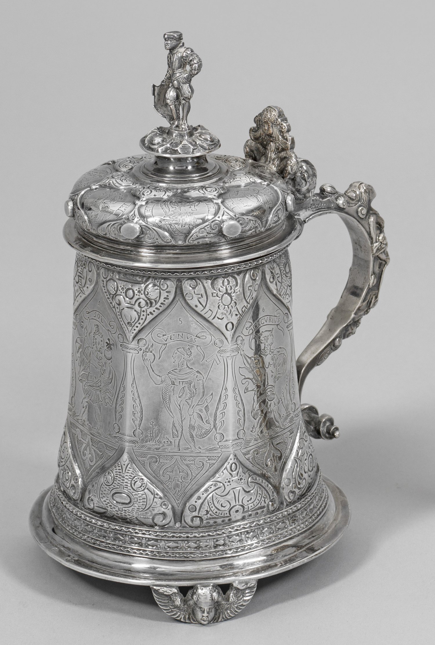 Historismus Götter-Humpen Silber. Auf drei Cherubinen stehender, runder, im Mittelteil siebenkantiger Korpus. Wandung umlaufend graviert mit sieben mythologischen Götterfiguren. Auf gewölbtem Deckel sieben gravierte Profilköpfe und abschließend plastischer Knauf in Gestalt eines Schildknappen. Volutenhenkel und Daumenrast mit Maskarons. Im Boden eingearbeitete Münze mit Kaiser Maximilian. Innen vergoldet. Gest. "13" (Lot). Meistermarke CB. Gew. 660 g. H. 21 cm.