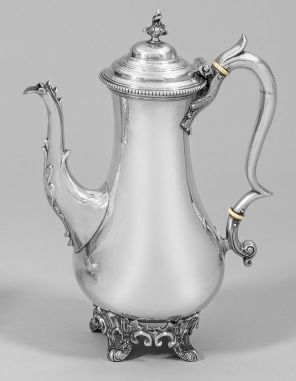 Frühe Kaffeekanne von Tiffany Young & Ellis Silber. Von geschweiften Rocaillefüßen getragener, birnenförmiger Korpus mit hoch angesetzter Tülle. Auf der glatten Wandung gravierter Namenszug, dat. 1854. Hoch aufgewölbter Deckel, am Rand gerahmt von schmalem Perlfries sowie zentraler Muschelknauf. Volutenhenkel. Gest., Herstellerzeichen. Gew. ca. 880 g. H. 26,5 cm.