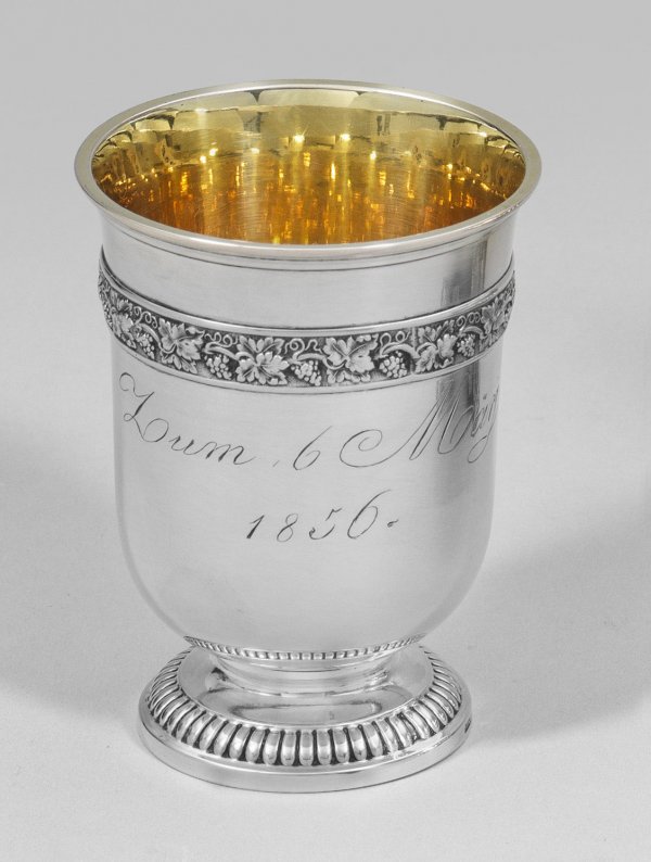 Spätbiedermeier-Fußbecher Silber, teilvergoldet. Über gerieftem Fuß leicht konisch ansteigende, zur Mündung leicht ausschwingende Wandung. Unterhalb der Mündung fein reliefierter Weintrauben-Fries. Schauseitig Widmungsgravur: "Zum 6. März 1856". Innen vergoldet. Gest. Herstellerzeichen und wohl Lötigkeit 13. Gew. ca. 95 g. H. 9 cm.
