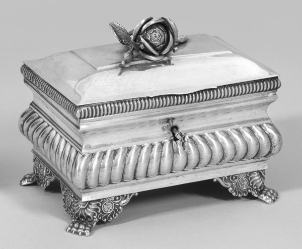 Spätbiedermeier-Zuckerdose Silber. Über vier schräggestellten Tatzenfüßen bewegte Kastenform mit konvexer Godronierung und konkaver glatter Wandung. Zahnschnittähnlicher Fries unterhalb des gewölbten, glatten Deckels mit reliefplastischem Knauf in Rosenform. Gest., Tremolierstich, Stadtmarke, Meister Jean Jacques Godet (wird Meister 1795). Gew. ca. 532 g. H. 14 cm. 15,5 cm x 10,5 cm.