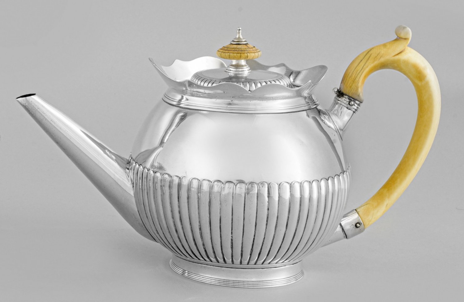 George IV-Teekanne Silber. Runder, bauchiger Korpus mit weit ausgestelltem, wellenförmigem Rand. Untere Wandungshälfte senkrecht godroniert. Tief angesetzter Röhrenausguss. Deckelknauf und geschwungener Ohrenhenkel aus Elfenbein. Gest.; Beschaumarke, Stadtmarke, Steuermarke, Meister Solomon Hougham (tätig seit 1792). Gew. ca. 570 g. H. 16 cm.
