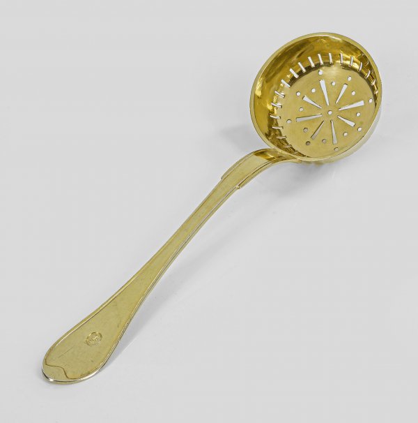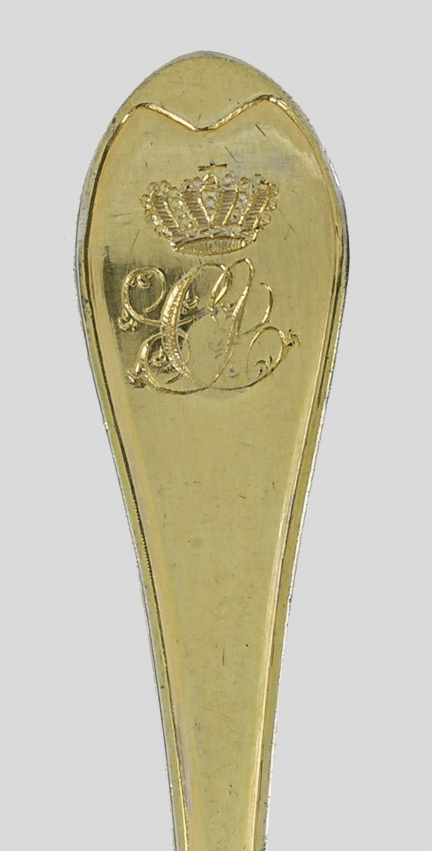 Vollvergoldet. Runde, stabförmig und punktuell durchbrochen gearbeitete, tiefe Laffe, übergehend in randprofilierten Griff mit gerundetem Heft. Auf der Heftunterseite das gravierte Monogramm "C J" unter der Königskrone. Auf der Vorderseite ein später ergänztes Besitzermonogr. "M R" unter fürstlicher Krone. Gest.; Stadt-, Beschau-, Jahresmarke "M 3", Meister Gustaf Folcker (wird Meister 1807). Gew. ca. 80 g. L. 21 cm.