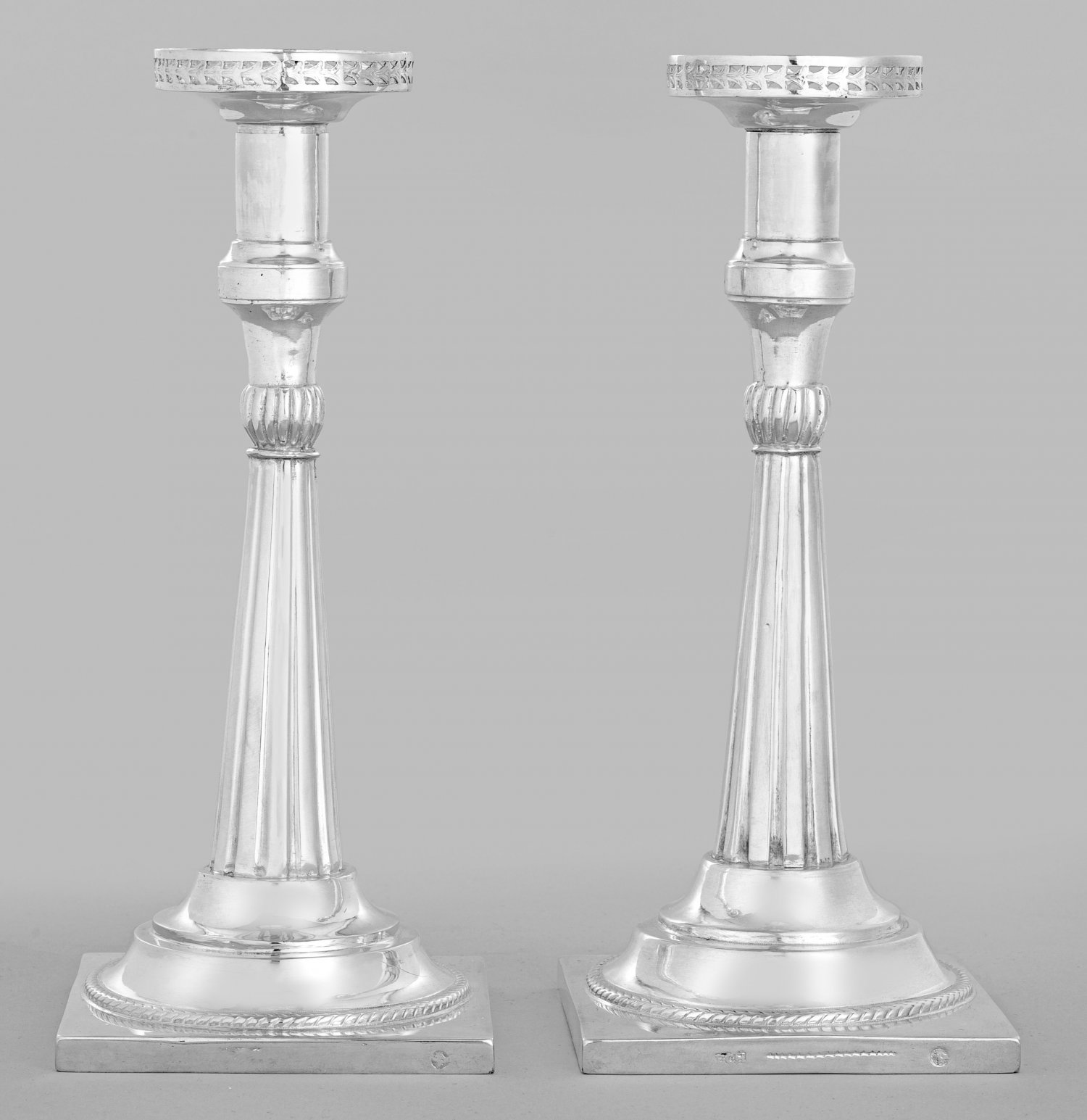 Paar Empire-Tafelleuchter Silber. Von einem stilisierten Blattkranz gerahmter, runder Stand über quadratischer Plinthe. Trompetenförmiger, kannelierter Säulenschaft in einem godronierten Nodus endend. Darüber eine glatte, durch Wulst profilierte Tülle, mit weit ausschwingender Traufschale und hochgezogenem, durchbrochen gearbeitetem, ornamentiertem Lippenrand. Gest.; teilw. Tremolierstrich, Stadtmarke. Meister Esajas Carl Hoffmann (wird Meister 1781). Ges.-Gew. ca 525 g. H. 23,5 cm.