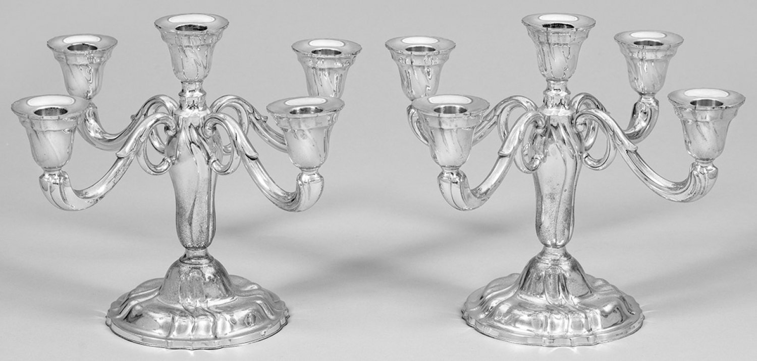 Paar Bremer Girandolen Silber. 5-flg.; Trompetenförmiger Stand, übergehend in von geschweiften Graten gegliederten Schaft mit vasenähnlicher Tülle. Von korrespondierendem Einsatz ausgehend vier volutengeschweifte Leuchterarme. Gest. 835, Modellnummer 9442, Herstellerzeichen. Gew. zus. ca. 1815 g (beschwert). H. 25 cm.