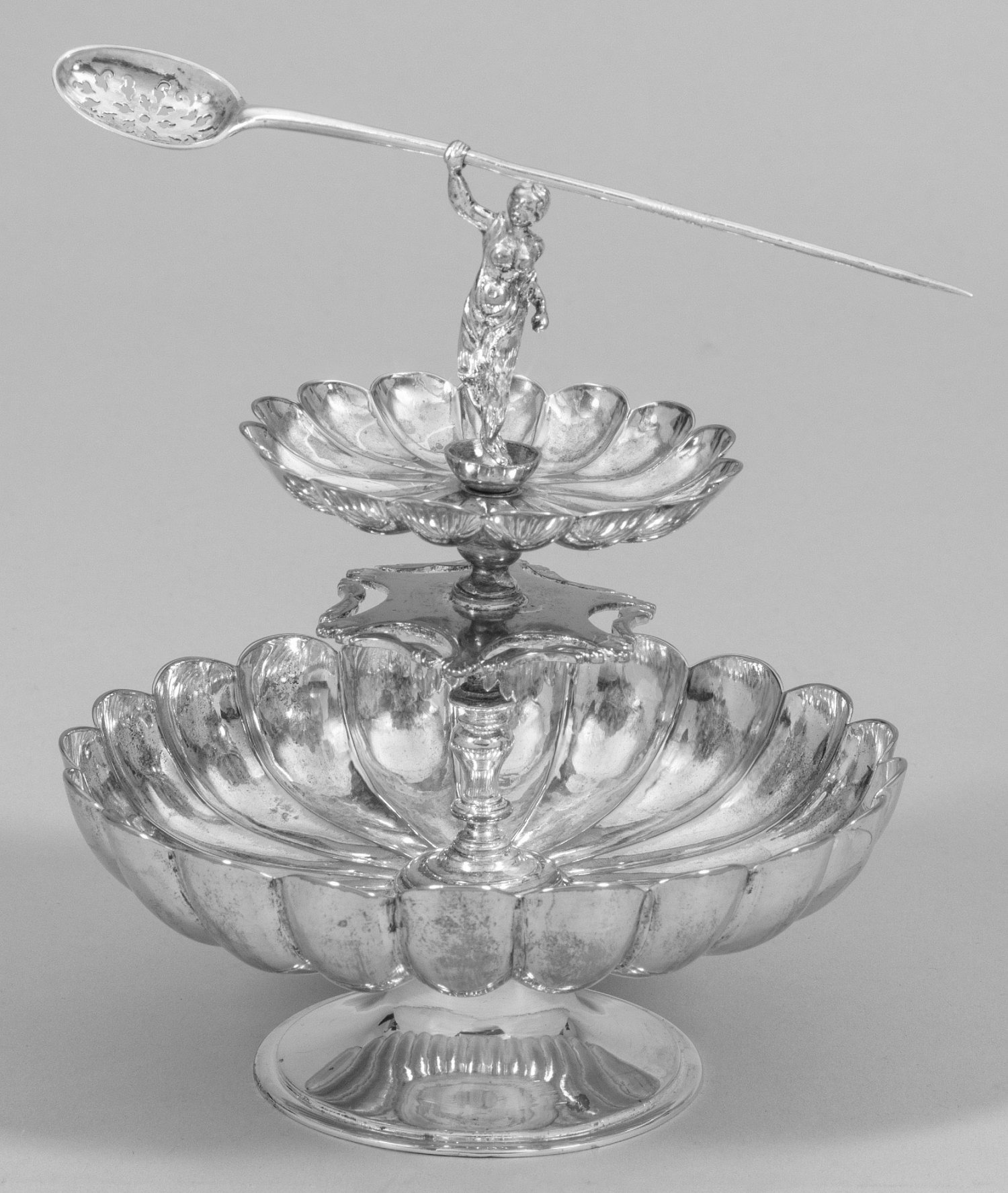Seltene Barock-Etagère Silber. Einem italienischen Springbrunnen nachempfundene, zweistufige Anbietschale mit plastisch ausgeformter, schreitender Venus als Handhabe. Über einem trompetenförmigen Stand godronierte Schale. Balusterförmiger Schaft mit feiner Durchbrucharbeit, darüber eine schmalere, zweite godronierte Schale. Dazu ein langstieliger Sieblöffel. Gest., Stadtmarke, Beschauzeichen, Meisterzeichen Georg Matthias Eimbeke (wird Meister 1709). Gew. ca. 290 g. H. 17 cm.