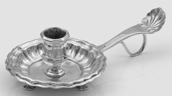 Seltener Wiener Barock-Handleuchter Silber. Auf drei Füßen stehende Schale mit umlaufender gondrierter Wandung und vasenförmiger Tülle im Spiegel. Glatte Handhabe, in Muscheldekor endend, unterhalb Ringgriff. Gest. Stadtmarke, Meister Johann Michael Muethreich (tätig seit 1695). Repunziert um 1807. Gew. ca. 138 g. H. 15,5 cm.